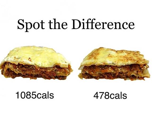 Perbedaan kalori yang cukup besar terdapat antara gambar kiri dan kanan. Padahal lasagna di sebelah kanan menggunakan bahan yang lebih banyak jenisnya, lho!