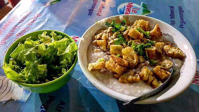 Selain disajikan dengan suwiran daging ayam dan cakwe, bubur gurih ini juga dihidangkan dengan lauk lain seperti potongan ati ampela, telur, tong cai atau sawi asin, dan kecap asin. Semakin menarik karena adanya cacahan daun selada yang menghasilkan cita rasa segar pada bubur ayam.