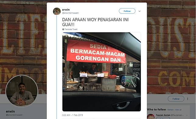 Melalui kolom komentar, @FakhriAld mencoba membagikan kepada warga Twitter penampakan bagian dalam banner dari penjual gorengan yang difoto oleh @erwinbimasakti.