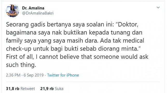 "Seorang gadis bertanya saya soal ini: "Dokter bagaimana saya nak buktikan kepada tunangan dan family kalau saya masih dara. Ada tak medical check-up untuk membuktikannya sebab mereka meminta". First of all, I cannot believe that someone would ask such thing," cuitnya di Twitter.
